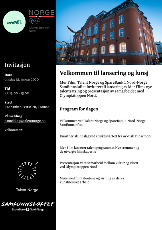 Mer Film, Talent Norge og Sparebank1 Nord-Norge Samfunnsløftet inviterer til et møte om talentutvikling av filmskapere i nord.