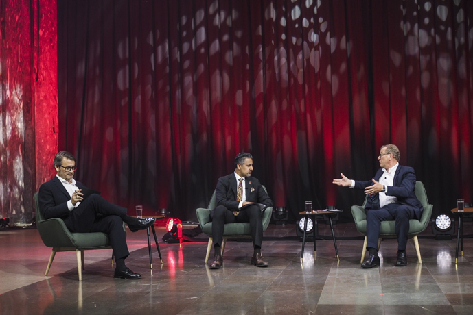 Programleder Thomas Seltzer, kulturminister Abid Q. Raja og styreleder i Talent Norge John G. Bernander i samtale. Foto: Caroline Roka.