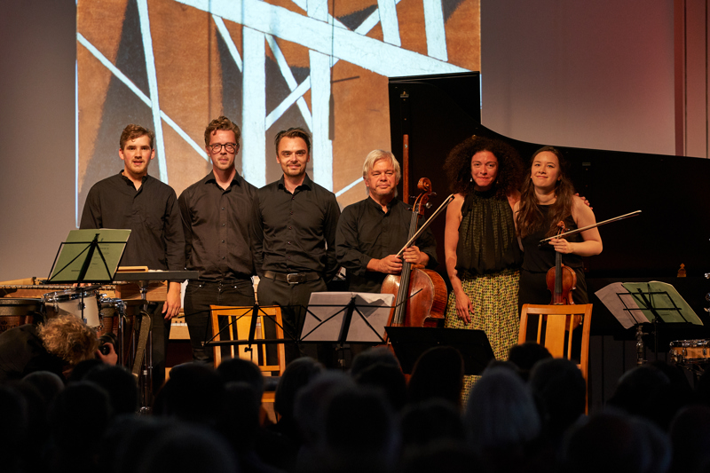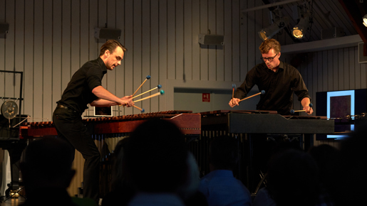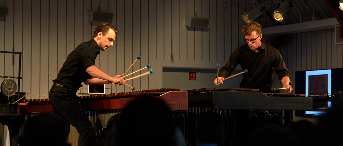Crescendo-deltakerne PERCelleh (slagverk) Kristoffer Almås og Bjørn-Christian Svarstad, Sonoko Miriam Welde (fiolin) og Amalie Stalheim (cello) spilte på fem ulike konserter på kammermusikkfestivalen.